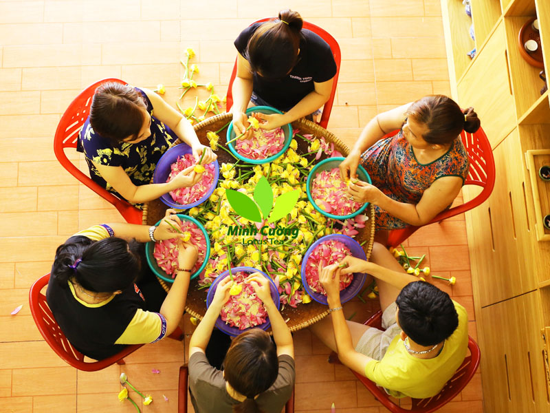 Làm trà sen ngoài cách ướp trực tiếp với những bông hoa nở trên đầm, vốn là cách của mấy văn nhân tài tử. Với trà sen Minh Cường, người thợ trà hái những bông sen từ sớm, vừa hé nở. Sau đó, nhanh chóng tách nhị hoa (hay gạo sen) khỏi bông rồi dùng gạo sen để ướp trà. Công đoạn tỷ mẩn, mỗi người cả ngày tách may ra được một hai lạng gạo sen. Trong khi đó, để ướp được 1 kg trà sen Hồ Tây cần cả ngàn búp sen.